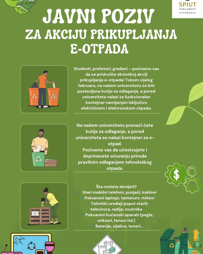 Pozivamo vas da se pridružite ovoj važnoj inicijativi i doprinesete smanjenju negativnog uticaja tehnološkog otpada na prirodu. Na našem univerzitetu postavljene su kutije za odlaganje, a pored univerziteta se nalazi kontejner za e-otpad.