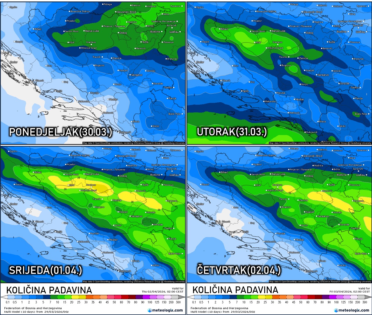 U ponedjeljak i utorak očekuju se uglavnom slabe do lokalno umjerene padavine, dok bi sredinom sedmice, usljed uticaja novog ciklona, u pojedinim područjima ponovo moglo doći do intenzivnijih padavina. Kiša će preovladavati u nižim predjelima, dok se u višim krajevima, iznad oko 400 do 500 metara nadmorske visine, očekuju susnježica i snijeg.