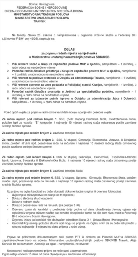 08.02.2024 10:361 Min Read Aktuelno Oglas za popunu radnih mjesta namještenika u Ministarstvu unutrašnih poslova SBK 08.02.20241 Min Read Share Tweet You may also like Aktuelno Dva automobila Škoda Fabia dobili svoje vlasnike – Završena velika FIS-ova nagradna igra 2 hours ago Aktuelno TURBE NE ZABORAVLJA: Dan kada je odbranjena Srednja Bosna obilježava se 20. aprila 14 hours ago Aktuelno Travnik domaćin 17. Festivala rada: Više od 1.000 učenika iz 69 škola u BiH dolazi 9. maja u naš grad (VIDEO) 21 hours ago HITNO potrebna krv u JU Bolnica Travnik Prije godinu dana napustio nas je legendarni Miroslav Ćiro Blažević