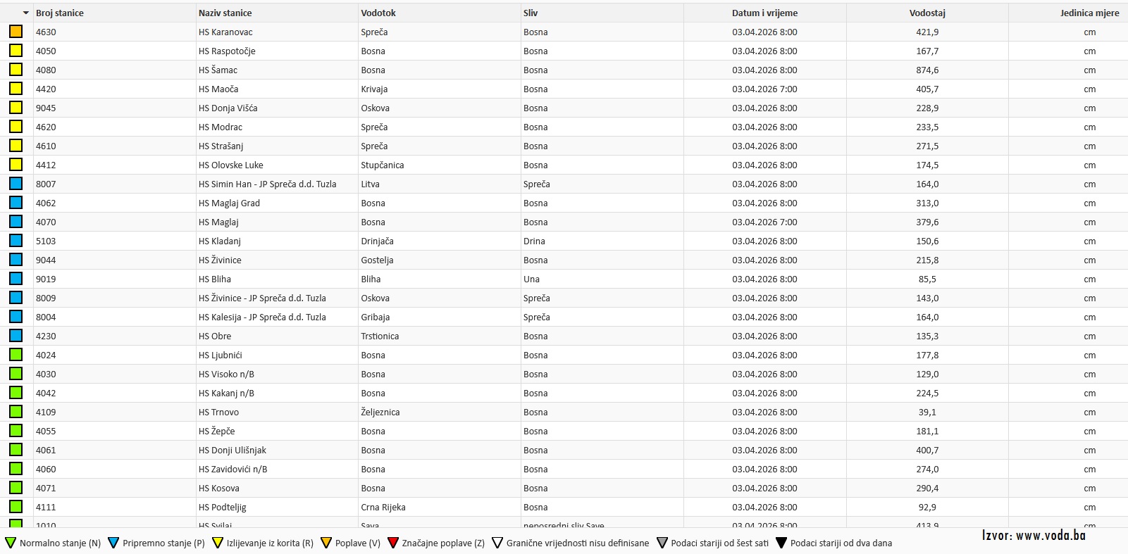 Na pojedinim lokacijama rijeke su se već izlile iz korita, dok su na više mjernih stanica dostignuti nivoi koji odgovaraju pripremnom stanju ili redovnoj odbrani od poplava.